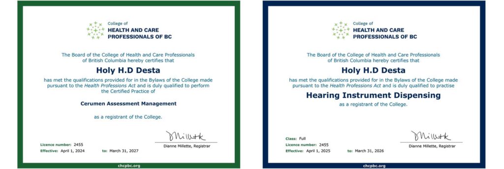 Holy is the heart of our in-clinic hearing care at Hear at Home Hearing Clinic in North Vancouver. As a licensed Hearing Instrument Practitioner, she works directly with adults of all ages to provide expert hearing assessments, hearing aid fittings, and cerumen (earwax) removal—all in a calm, welcoming clinic environment. A graduate of Douglas College and a lifelong resident of Greater Vancouver, Holy is passionate about improving lives through better hearing. She’s especially skilled at helping clients feel comfortable, informed, and confident as they begin or continue their hearing health journey.